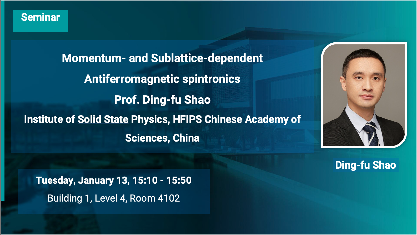 Ding-fu Shao, Ding-Fu Shao is currently a professor at Institute of solid state physics, Hefei Institutes of Physical Science, Chinese Academy of Sciences. He received his bachelor degree from China University of Mining and Technology in 2008, and Ph.d. from University of Chinese Academy of Sciences in 2013. He was a research assistant professor at Institute of Solid State Physics, Hefei Institutes of Physical Science, Chinese Academy of Sciences from 2013 to 2016, and then worked as a postdoc at University of Nebraska-Lincoln from 2016 to 2021. Ding-Fu’s research is focused on exploring the fundamental properties of quantum materials use first-principles calculations along with model approaches. He has published more than 70 peer-reviewed papers, including 30+ first author or corresponding author paper in high-profile journals such as Physical Review Letters, Nature Communications, Science Advances. Recent interests include the transport properties in antiferromagnetic and ferroelectric materials and their applications in electronic and spintronic devices.