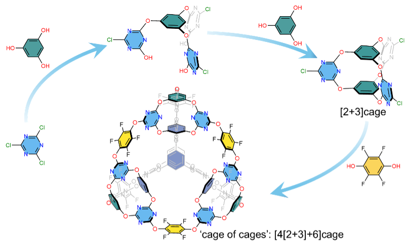 This presentation will focus on the computational design and experimental discovery of porous organic molecular materials,[1] including selectively permeable membranes[2], low-density molecular crystals,[3] and selectively porous organic crystals.[4] I will demonstrate how we have developed organic cages and macrocycles as building blocks for the assembly of porous materials, including covalent organic frameworks,[5] hydrogen-bonded organic frameworks,[6] porous organic cages,[7] and metal-organic polyhedra.[8] In one of these studies, I will show how we developed a two-step, hierarchical synthesis strategy that assembles a trigonal prismatic organic cage into a more symmetric, higher-order tetrahedral cage, referred to as a ‘cage of cages’ (see Scheme).[7] In another related study, I will show how we used trianglsalen macrocycles as preorganised building blocks to assemble octahedral-shaped metal-organic polyhedra that inherit most of the properties of the macrocyclic ligands, including their well-defined cavities and chirality.[8] During the presentation, I will also cover recent work on translating the chemistry described here to a flow chemistry platform to enable scale-up of the building blocks to accelerate materials testing, including the development of new automated workflows using new reactors and optimisation tools. Underpinning these studies, I will demonstrate how we have developed digital tools to screen material properties, including porosity,[9] and to classify data, including powder X-ray diffraction patterns.[10] I will conclude by highlighting future opportunities for some of the materials described in the development of new selectively porous crystalline membranes, building on relevant work in this direction.[11]