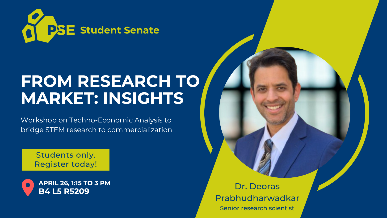 The event will be an interactive workshop focused on the fundamentals of techno-economics in research and development (R&D), as well as the technology development framework. Led by Dr. Deoras Prabhudharwadkar, this expert-led session will provide PSE students with foundational knowledge.
