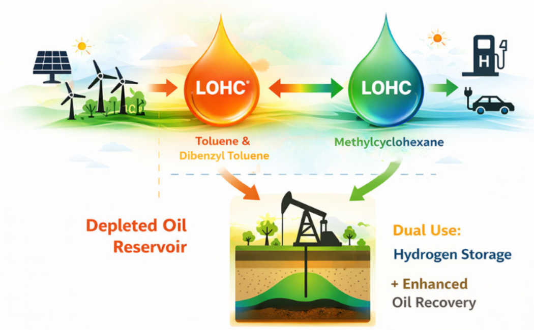 Researchers at King Abdullah University of Science and Technology (KAUST) have examined whether depleted oil reservoirs could be repurposed to store hydrogen energy underground using liquid organic hydrogen carriers (LOHC), which chemically bind hydrogen for safer storage. The study investigates how this approach could support energy storage while enabling additional oil recovery.
